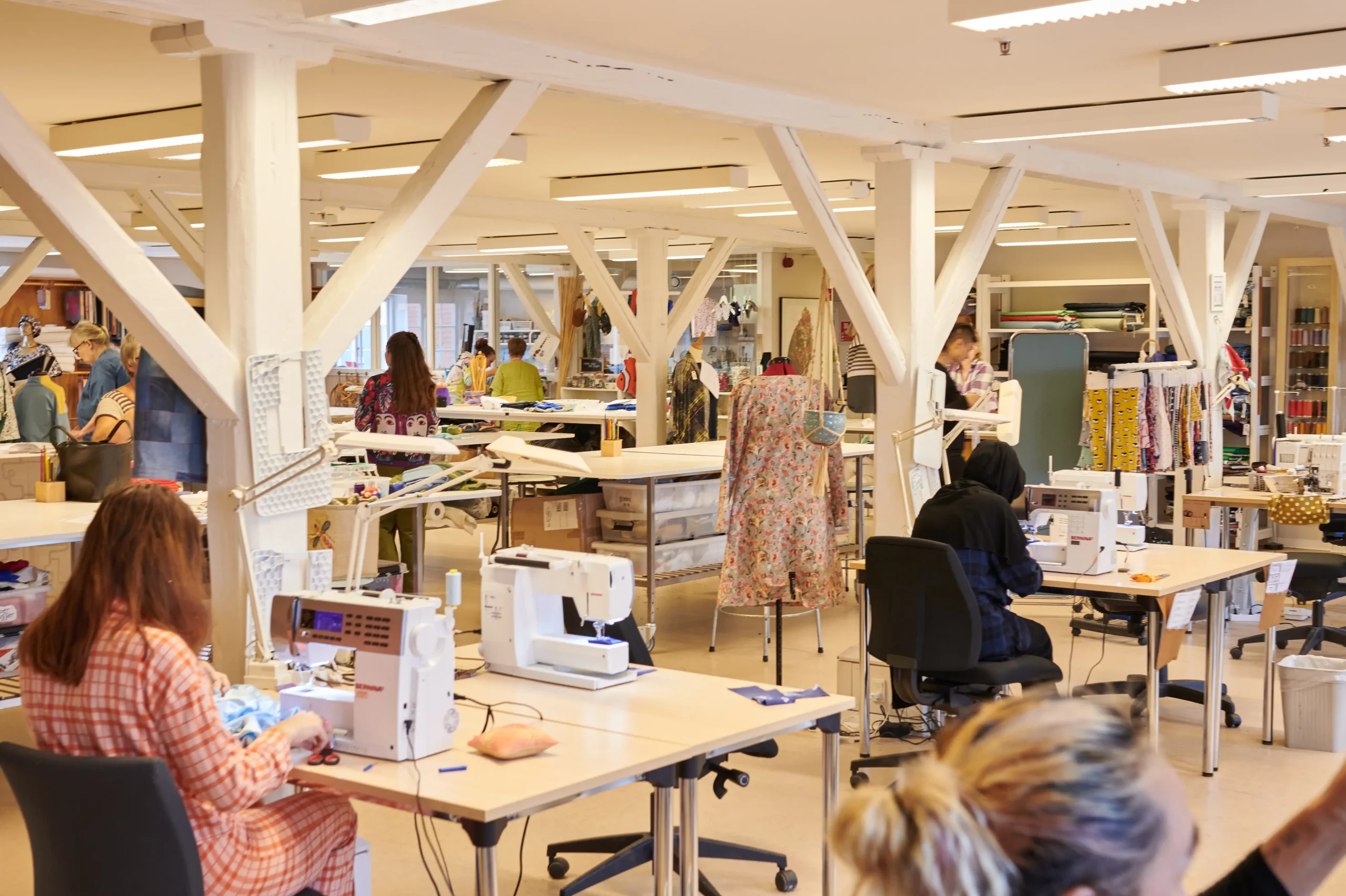 Grib stoffet, og giv dig i kast med at kreere din seneste kollektion, eller tag en af værkstedets dygtige medarbejdere under armen og lær at hækle, brodere, lappe huller eller batikfarve.